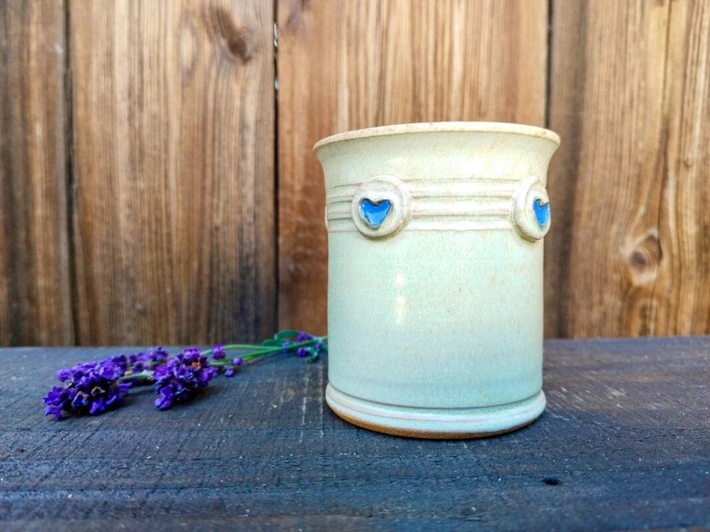 Béžová glazura mu dodává jemnou eleganci, zatímco plastická srdíčka kolem hrdla mu propůjčují jedinečný a hravý vzhled.