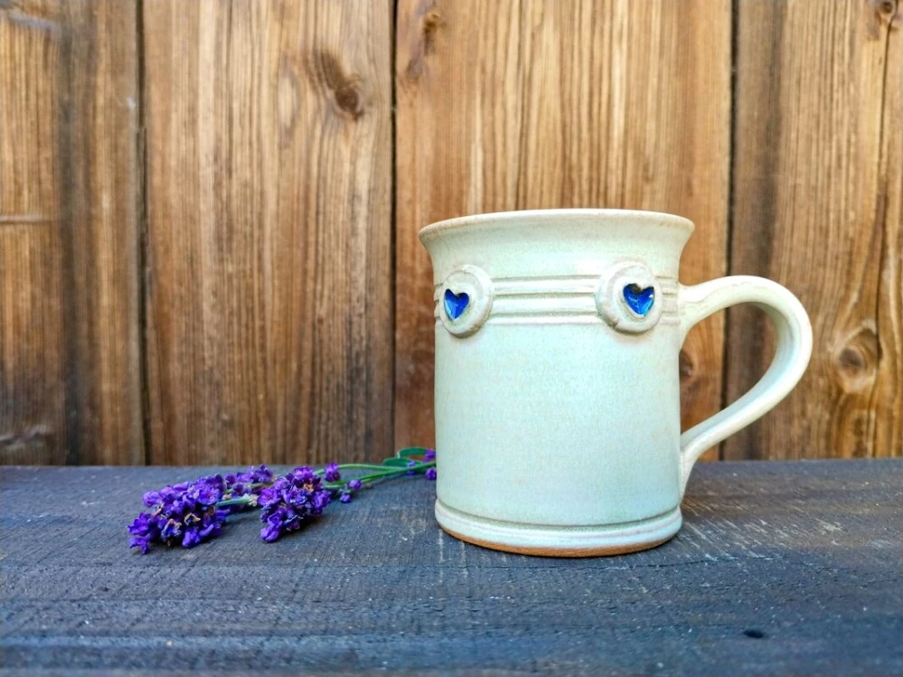 ✨ Magický detail! Srdíčka jsou vyplněna barevnou glazurou, která vytváří efekt lesklých kamínků nebo roztaveného skla. Na světle se krásně leskne a dodávají hrnečku šmrnc.