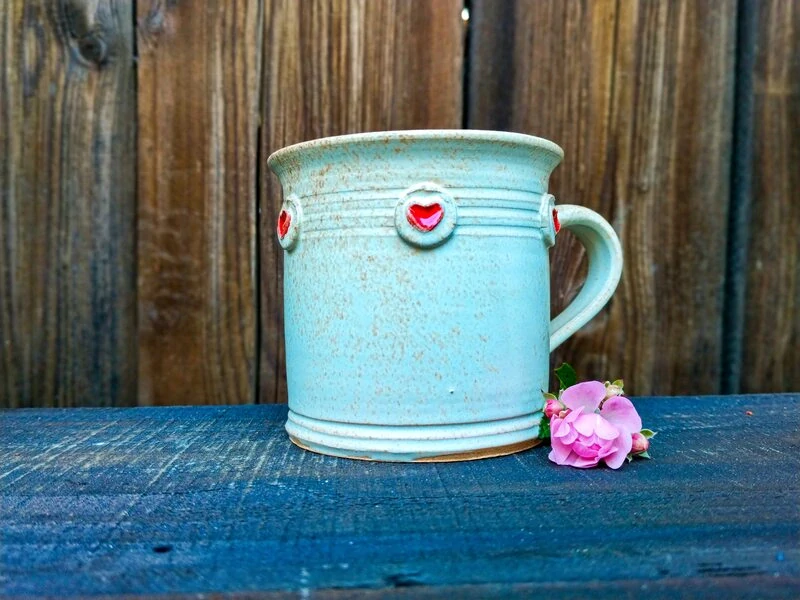 ✨ Magický detail! Plastická srdíčka jsou vyplněna barevnou glazurou, která vytváří efekt lesklých kamínků nebo roztaveného skla. Na světle se nádherně lesknou a dodávají hrnečku jedinečný vzhled.
