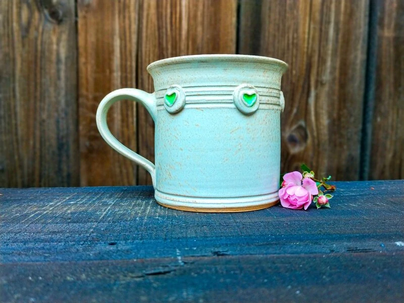 ✨ Magický detail! Plastická srdíčka jsou vyplněna barevnou glazurou, která vytváří efekt lesklých kamínků nebo roztaveného skla. Na světle se nádherně lesknou a dodávají hrnečku jedinečný vzhled.