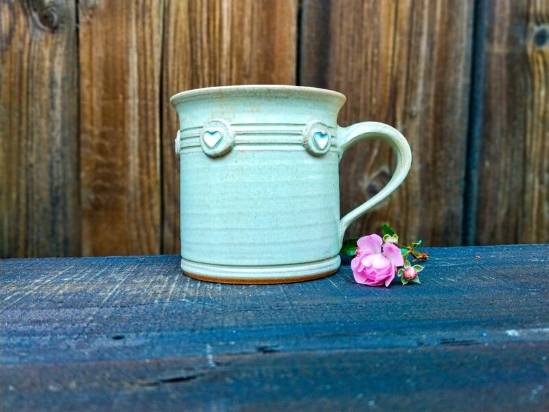 ✨ Magický detail! Plastická srdíčka jsou vyplněna barevnou glazurou, která vytváří efekt lesklých kamínků nebo roztaveného skla. Na světle se nádherně lesknou a dodávají hrnečku jedinečný vzhled.