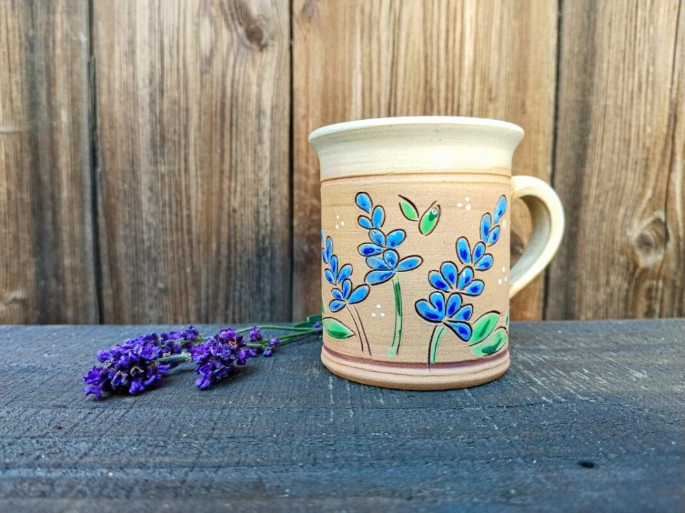 Uvnitř hrnku je béžová glazura, zatímco režný povrch na vnější straně zvýrazňuje ručně malovaný obrázek glazurami. Barvy jsou trvanlivé a odolné – hrnek můžete mýt v myčce, aniž by se obrázek smyl.