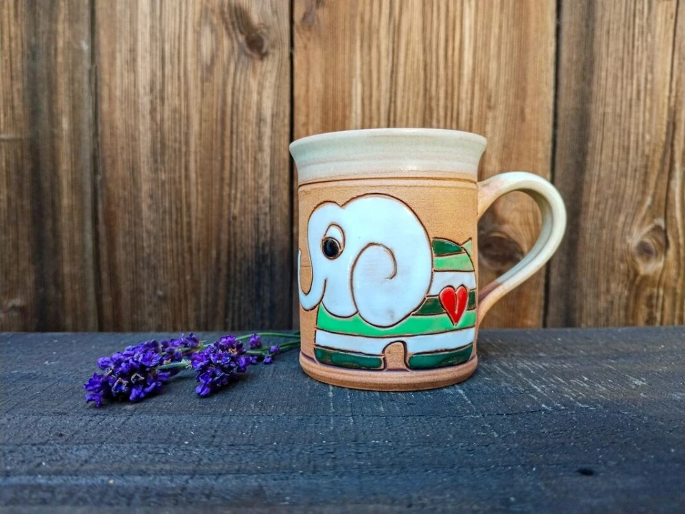 Uvnitř hrnku je béžová glazura, zatímco režný povrch na vnější straně zvýrazňuje ručně malovaný obrázek glazurami. Barvy jsou trvanlivé a odolné – hrnek můžete mýt v myčce, aniž by se obrázek smyl.