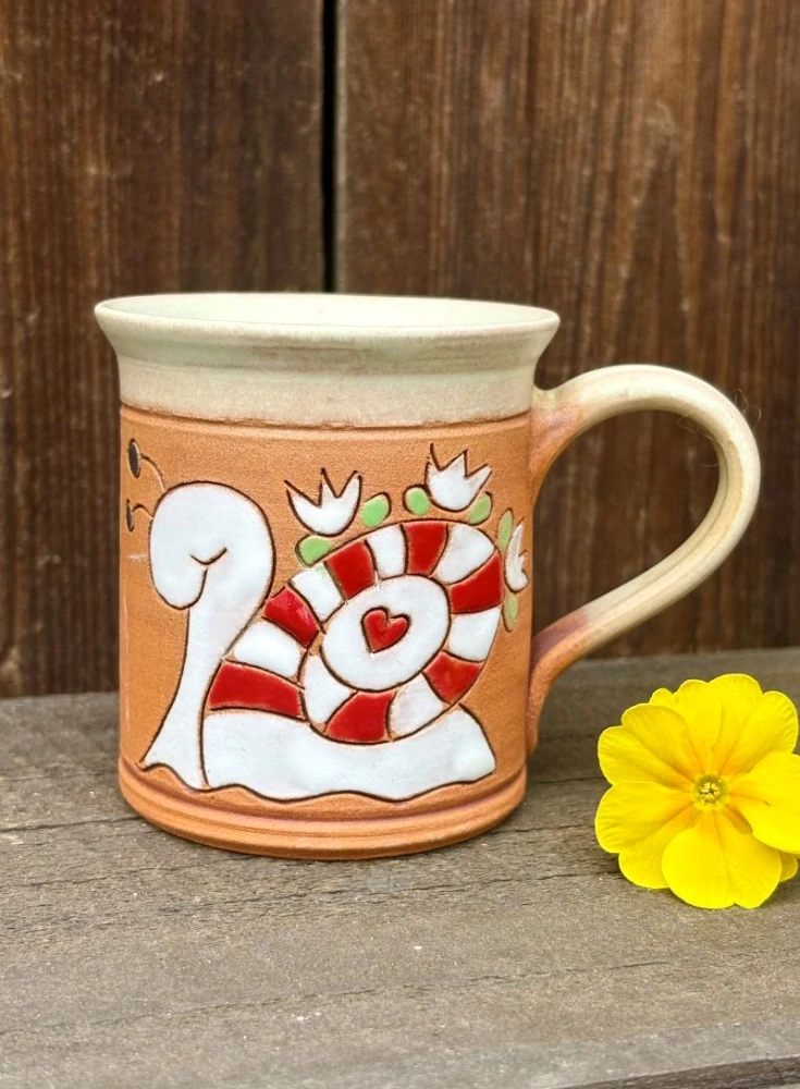 Uvnitř hrnku je béžová glazura, zatímco režný povrch na vnější straně zvýrazňuje ručně malovaný obrázek glazurami. Barvy jsou trvanlivé a odolné – hrnek můžete mýt v myčce, aniž by se obrázek smyl.