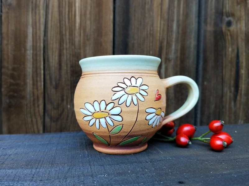 Uvnitř glazováno béžovou glazurou, zvenku režný povrch, aby na něm vynikl barevný obrázek, ručně MALOVANÝ GLAZURAMI = proto můžete hrneček bez obav umývat v myčce a barvy vydrží! Nesmyjí se!!!!