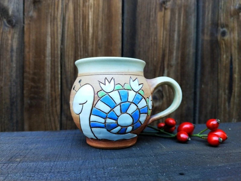 Uvnitř glazováno béžovou glazurou, zvenku režný povrch, aby na něm vynikl barevný obrázek, ručně MALOVANÝ GLAZURAMI = proto můžete hrneček bez obav umývat v myčce a barvy vydrží! Nesmyjí se!!!!