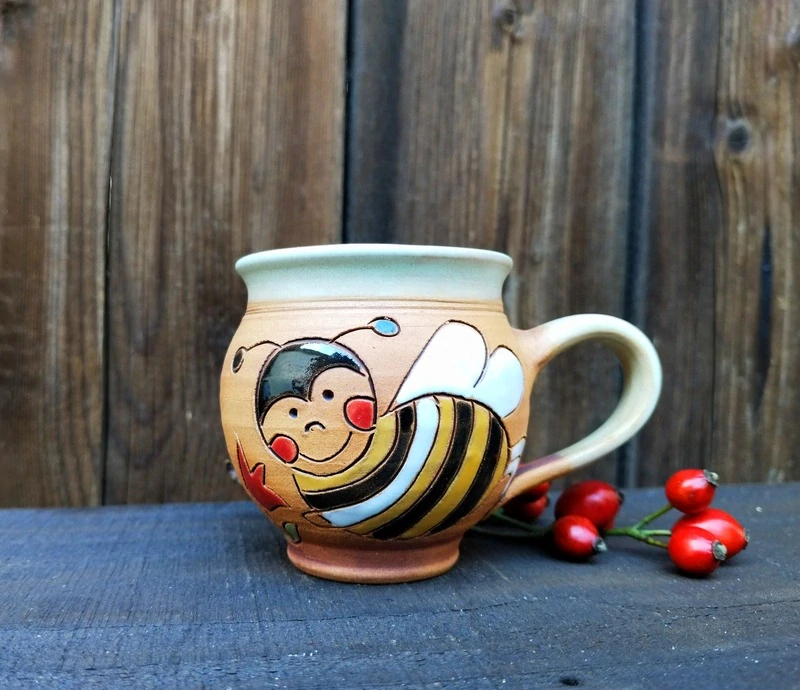 Uvnitř glazováno béžovou glazurou, zvenku režný povrch, aby na něm vynikl barevný obrázek, ručně MALOVANÝ GLAZURAMI = proto můžete hrneček bez obav umývat v myčce a barvy vydrží! Nesmyjí se!!!!