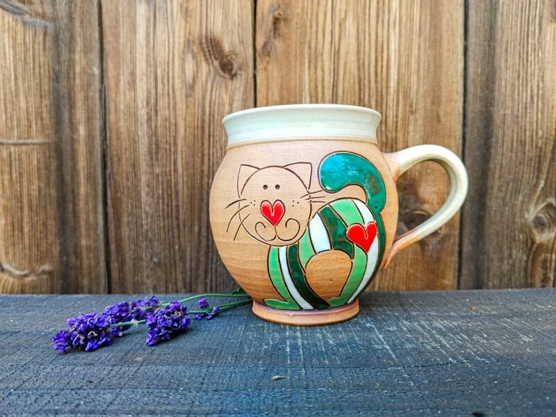 Každý hrnek je ručně točený na hrnčířském kruhu a zdobený originálním obrázkem malovaným glazurami. Díky této pečlivé ruční práci je každý kus opravdovým originálem, který vnese do vaší kuchyně osobité kouzlo.
