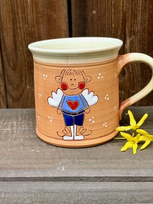 Uvnitř glazováno béžovou glazurou, zvenku režný povrch, aby na něm vynikl barevný obrázek, ručně MALOVANÝ GLAZURAMI = proto můžete hrneček bez obav umývat v myčce a barvy vydrží! Nesmyjí se!!!!