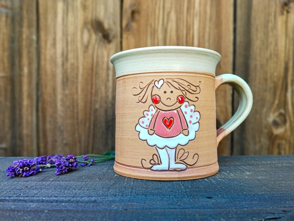 Uvnitř glazováno béžovou glazurou, zvenku režný povrch, aby na něm vynikl barevný obrázek, ručně MALOVANÝ GLAZURAMI = proto můžete hrneček bez obav umývat v myčce a barvy vydrží! Nesmyjí se!!!!