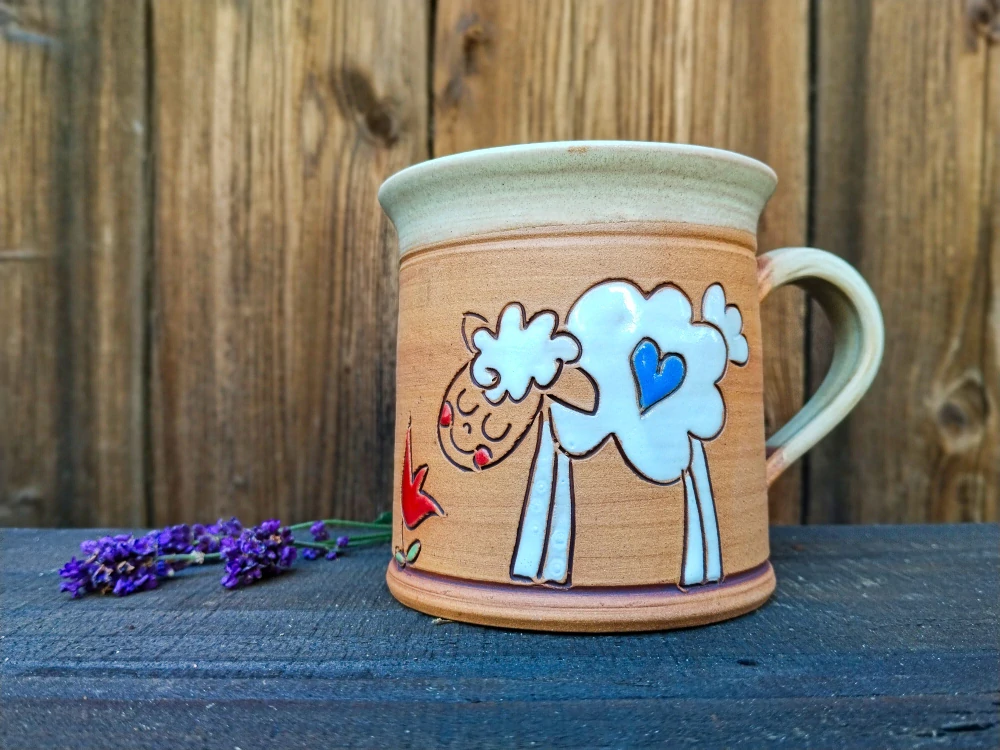 Uvnitř glazováno béžovou glazurou, zvenku režný povrch, aby na něm vynikl barevný obrázek, ručně MALOVANÝ GLAZURAMI = proto můžete hrneček bez obav umývat v myčce a barvy vydrží! Nesmyjí se!!!!