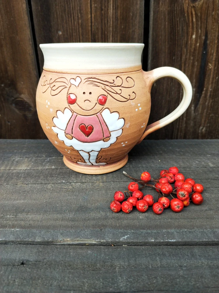 Uvnitř glazováno béžovou glazurou, zvenku režný povrch, aby na něm vynikl barevný obrázek, ručně MALOVANÝ GLAZURAMI = proto můžete hrneček bez obav umývat v myčce a barvy vydrží! Nesmyjí se!!!!