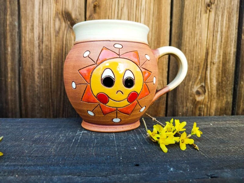 Uvnitř glazováno béžovou glazurou, zvenku režný povrch, aby na něm vynikl barevný obrázek, ručně MALOVANÝ GLAZURAMI = proto můžete hrneček bez obav umývat v myčce a barvy vydrží! Nesmyjí se!!!!