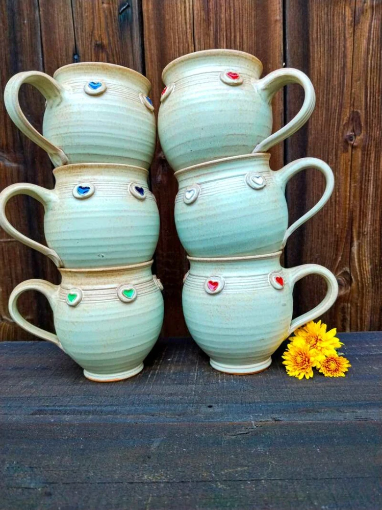✨ Magický detail! Plastická srdíčka jsou vyplněna barevnou glazurou, která vytváří efekt lesklých kamínků nebo roztaveného skla. Na světle se nádherně třpytí a dodávají hrnečku jedinečný vzhled.