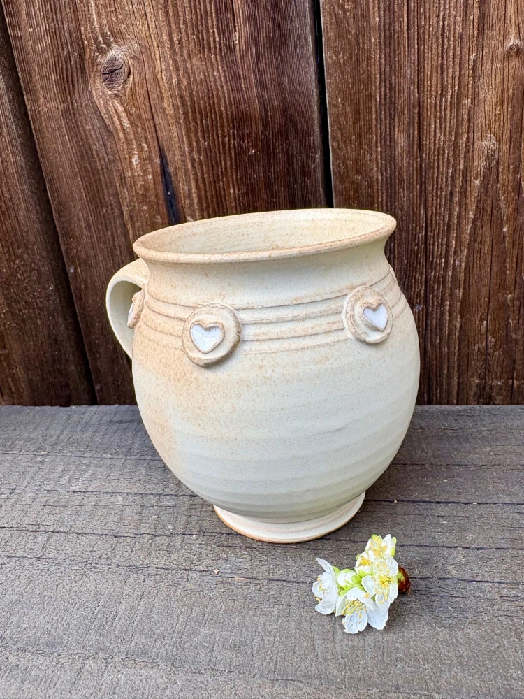 Pokud milujete velké hrnky a pořádný čaj, tento ručně vyráběný keramický hrnek o objemu 500 ml je přesně pro vás! Béžová glazura mu dodává jemnou eleganci, zatímco plastická srdíčka kolem hrdla mu propůjčují jedinečný a hravý vzhled.