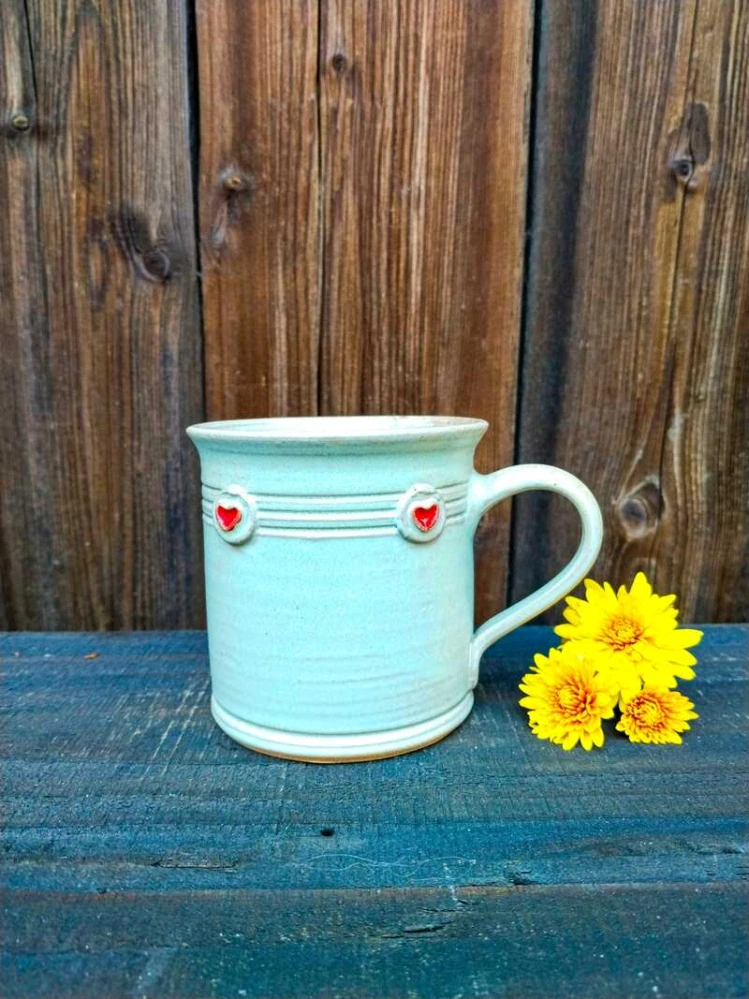 ✨ Magický detail! Srdíčka jsou vyplněna barevnou glazurou, která vytváří efekt lesklých kamínků nebo roztaveného skla. Na světle se krásně lesknou a dodávají hrnečku šmrnc.