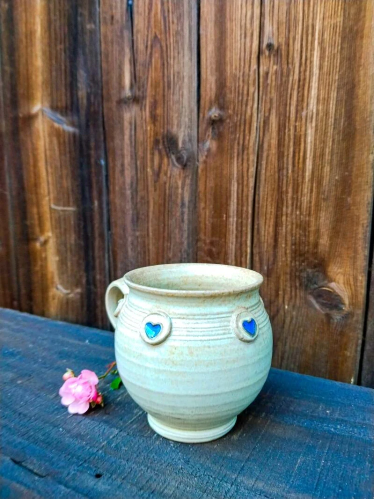 ✨ Magický detail! Plastická srdíčka jsou vyplněna barevnou glazurou, která vytváří efekt lesklých kamínků nebo roztaveného skla. Na světle se nádherně třpytí a dodávají hrnečku jedinečný vzhled.