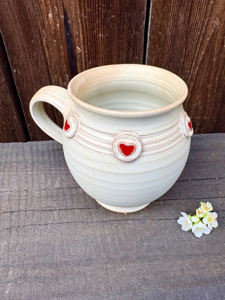 Pokud milujete velké hrnky a pořádný čaj, tento ručně vyráběný keramický hrnek o objemu 500 ml je přesně pro vás! Béžová glazura mu dodává jemnou eleganci, zatímco plastická srdíčka kolem hrdla mu propůjčují jedinečný a hravý vzhled.