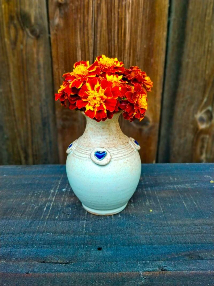 Každá váza je ručně točená na hrnčířském kruhu a kolem hrdla zdobena srdíčky.