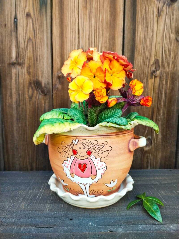 Ručně malovaný květináč s podmiskou. Vhodný dovnitř i ven. Velikost na větší muškát, begonii nebo rozmarýn.