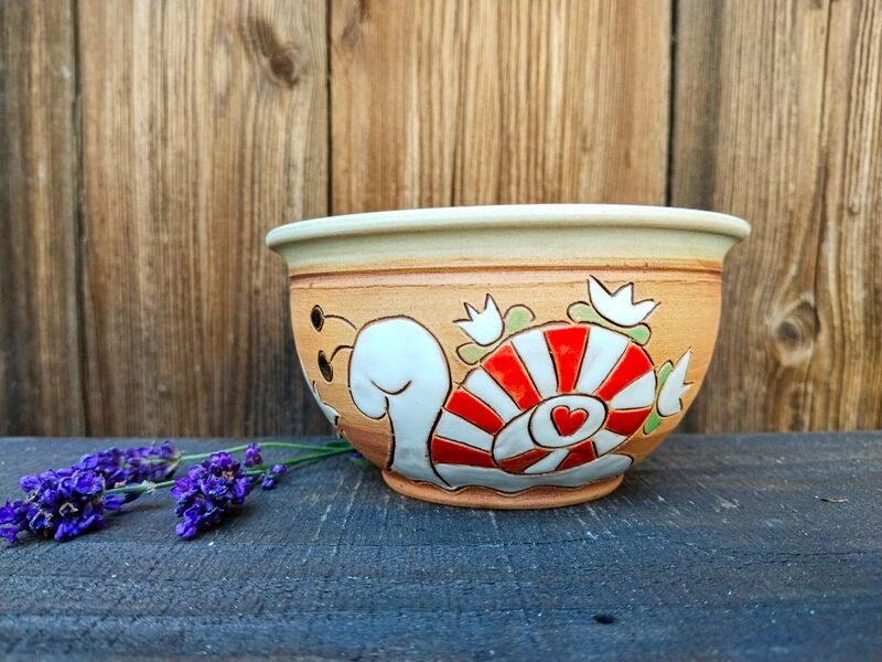 Uvnitř glazováno béžovou glazurou, zvenku režný povrch, aby na něm vynikl barevný obrázek, ručně MALOVANÝ GLAZURAMI = proto můžete misku bez obav umývat v myčce a barvy vydrží! Nesmyjí se!!!!